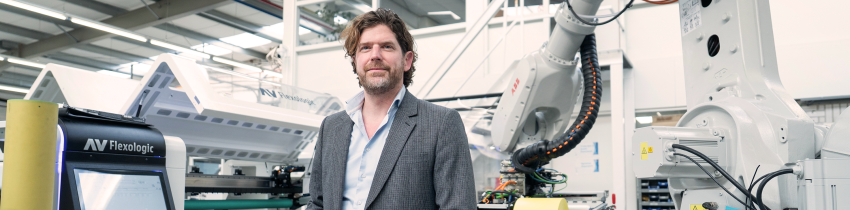 AV Flexologic is begonnen als klein familiebedrijf in prepress-machines. De flexografische drukwereld heeft hoge drukkwaliteit, korte omsteltijden en minder afval nodig. Tegelijk zijn ervaren operators schaars en fysiek zwaar belast. Dit vroeg om vergaande automatisering en robotisering.