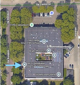 Technische Universiteit Eindhoven: Horsten 1, 5612 AX Eindhoven (Multimediapaviljoen/Disruptor). The entrance is located at the spot indicated by the blue arrow in the image below. The drinks will take place at the right, behind the small hallway after the large wooden entrance door.