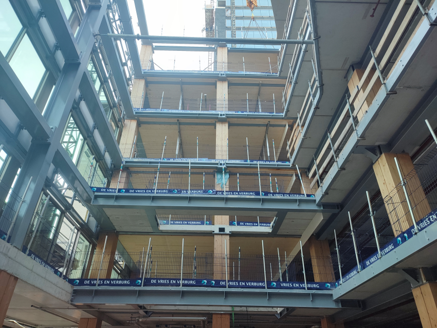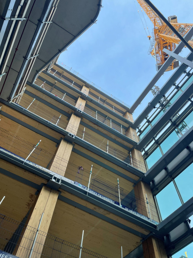 Het project zet sterk in op Net Zero Carbon ambities en hoge standaarden voor duurzaamheid en welzijn. EDGE Coolsingel is bovendien interessant vanuit constructief en circulair oogpunt: de opzet combineert een hout-hybride draagstructuur (o.a. houten kolommen en CLT-vloeren) met een betonnen kern, en er is een slimme strategie ontwikkeld om delen van de bestaande kelder/substructuur te hergebruiken.