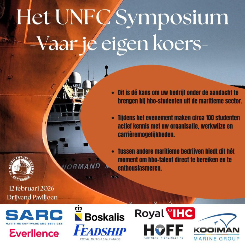 Op donderdag 12 februari 2026 organiseert UNFC het UNFC Symposium & Bedrijvenmarkt in het Drijvend Paviljoen in Rotterdam. Dit jaarlijkse evenement, georganiseerd door UNFC, de studievereniging van Maritieme Techniek in Rotterdam, brengt de maritieme sector samen met meer dan 100 gemotiveerde studenten. Het symposium staat in het teken van kennisdeling, inspiratie en het versterken van de verbinding tussen studenten en het bedrijfsleven.