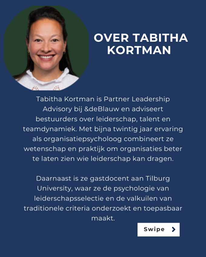 Tabitha Kortman is Partner Leadership Advisory bij &deBlauw, waar zij bestuurders en topmanagers adviseert over leiderschapsontwikkeling, talentselectie en effectieve teamdynamiek in complexe organisaties. Met bijna twintig jaar ervaring als organisatiepsycholoog combineert ze wetenschappelijke inzichten met praktische toepassing, en helpt ze organisaties beter zicht te krijgen op wie leiderschap kan dragen en hoe dat optimaal kan worden ingezet.