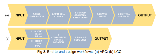 As the design engineer of this effort, I integrated academic research into end-to-end design workflows which seamlessly link design to production (Fig 3). The output of these workflows is twofold. Firstly, utilizing a newly developed mortar containing cork aggregates, I introduced a meso-scale metamaterial based on the Alternating Point Connection (APC) principle (Fig 5). This workflow populates the volume of the wall with APC unit cells, achieving 19% lower U-value compared to Fig 2. Integrated demonstrator Fig 3. End-to-end design workflows; (a) APC; (b) LCC benchmark 3DCP walls, meeting the Dutch standards for residential thermal comfort (U ≤ 0.21 W/m²K).