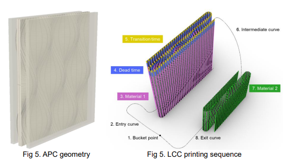 This wall acts both as load-bearing and façade, simplifying the production and transportation of prefabricated 3DCP walls. Secondly, using system automations in the dosing of the printing material components, I created a parametric model which translates the design into a printable geometry with variable material properties. This process is called Local Composition Control (LCC) (Fig 5). Now mass customization can be achieved, not only through design freedom – the main merit of 3DCP up to now – but also through bespoke material variation. Such process control enables 24/7 production lines, reduces human intervention, increases safety and limits material waste.