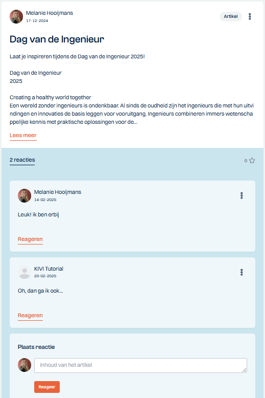 Je kan op een bericht reageren door onder het bericht naar ‘plaats reactie’ te gaan. Ook kan je op het sterretje klikken om een bericht te ‘liken’.