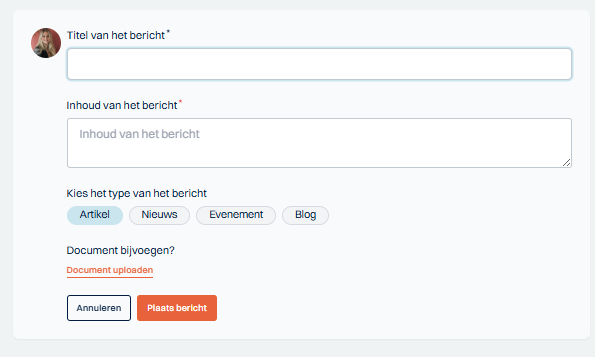 Vervolgens kies je de categorie van het bericht: artikel, nieuws, evenement of blog.