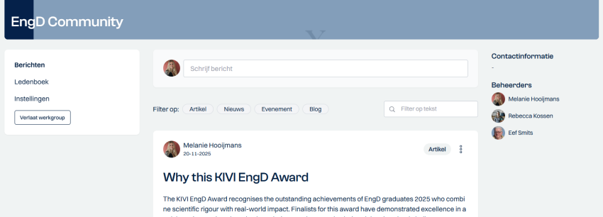 In de rechterkolom zie je de contactinformatie van de beheerder van de werkgroep en de beheerders.