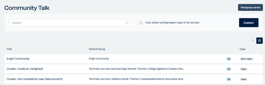 In het menu zie je ‘Community Talk’, hier zie je alle werkgroepen die er zijn. Er zijn werkgroepen die open toegankelijk zijn voor alle leden maar ook werkgroepen die enkel toegankelijk zijn op uitnodiging. Je kan op een werkgroep klikken om toegang te krijgen of deel te nemen aan de werkgroep.